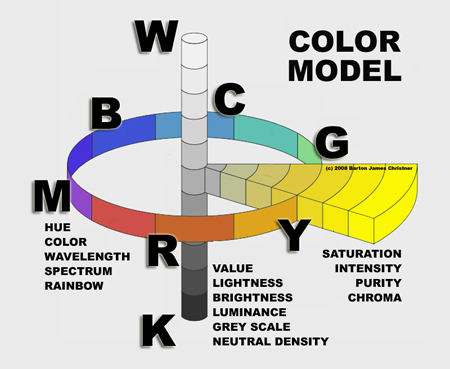 - Radius - Saturation, Intensity Purity, Chroma (think amount of drops of color into bucket of white paint)