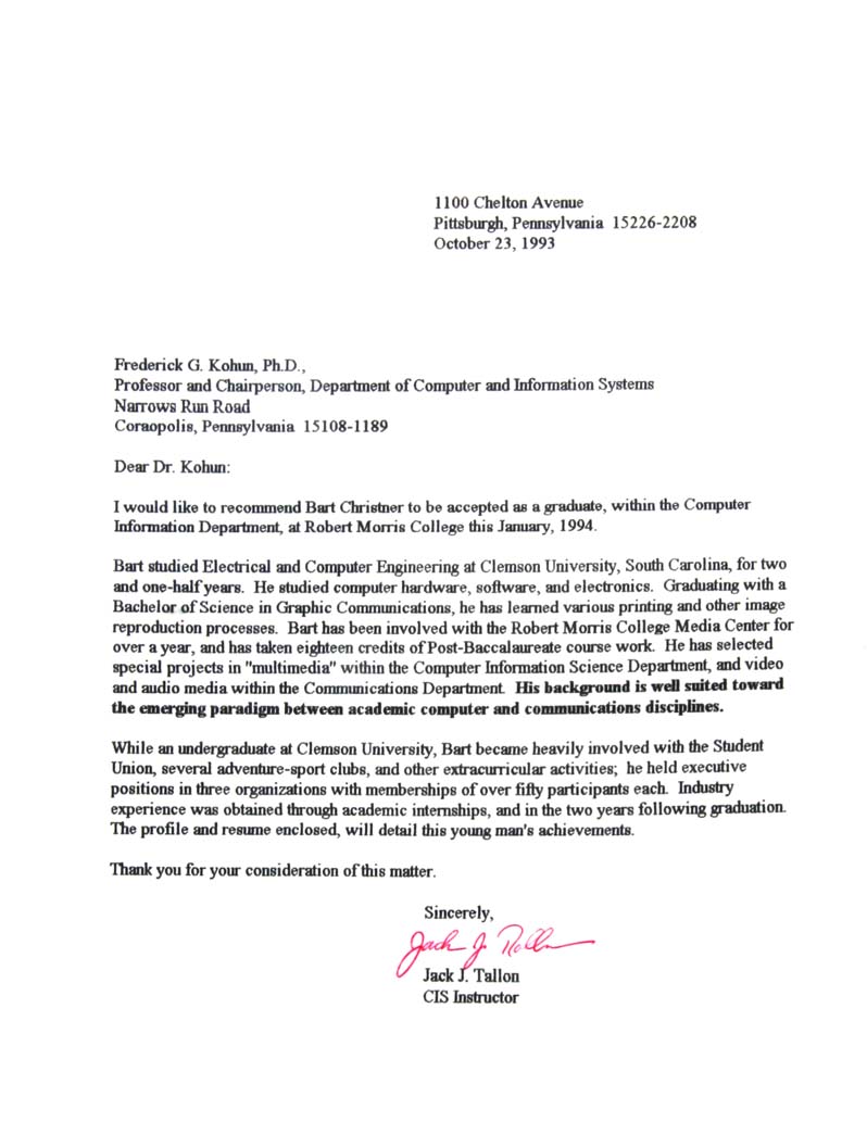 - I would like to recommend Bart Christner to be accepted as a graduate, within the Computer Information Department, at Robert Morris College this January, 1994.
