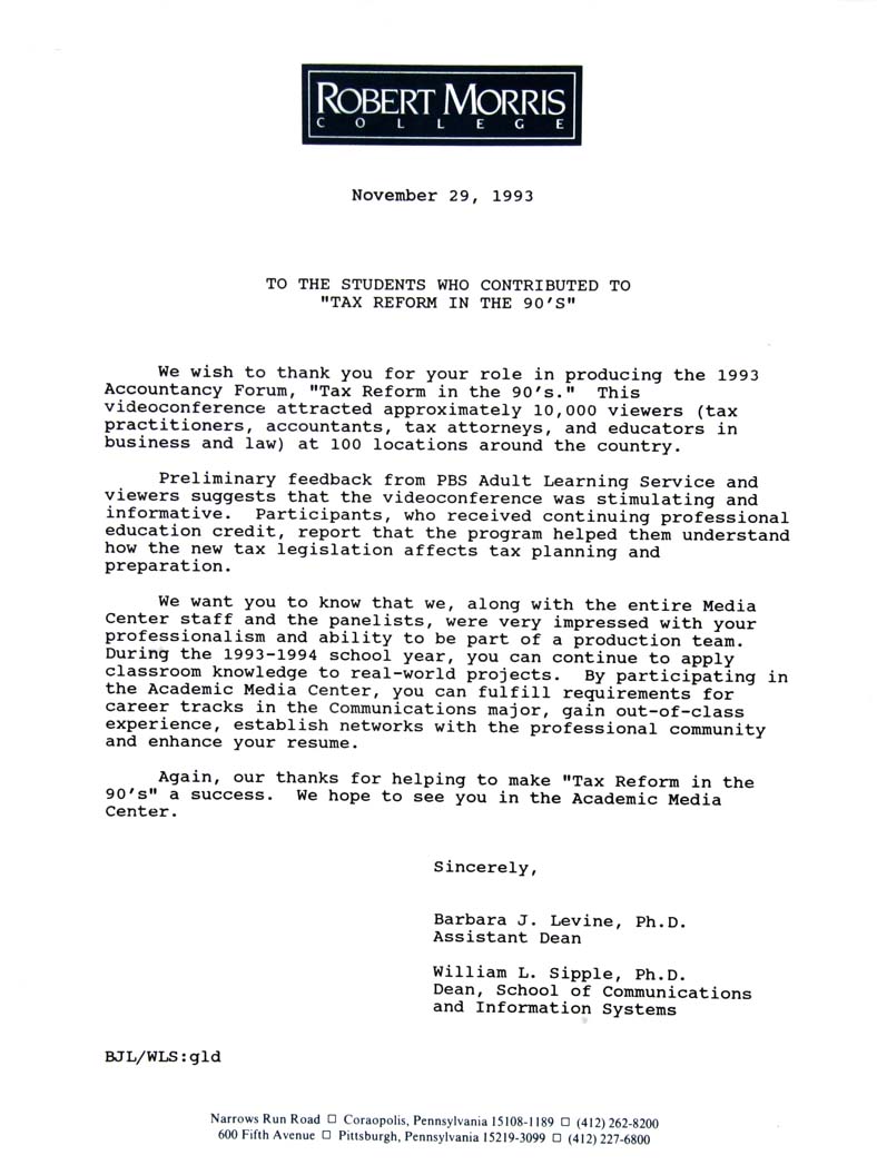 - Again, our thanks for helping to make "Tax Reform in the 90's" a success. We hope to see you in the Academic Media Center.