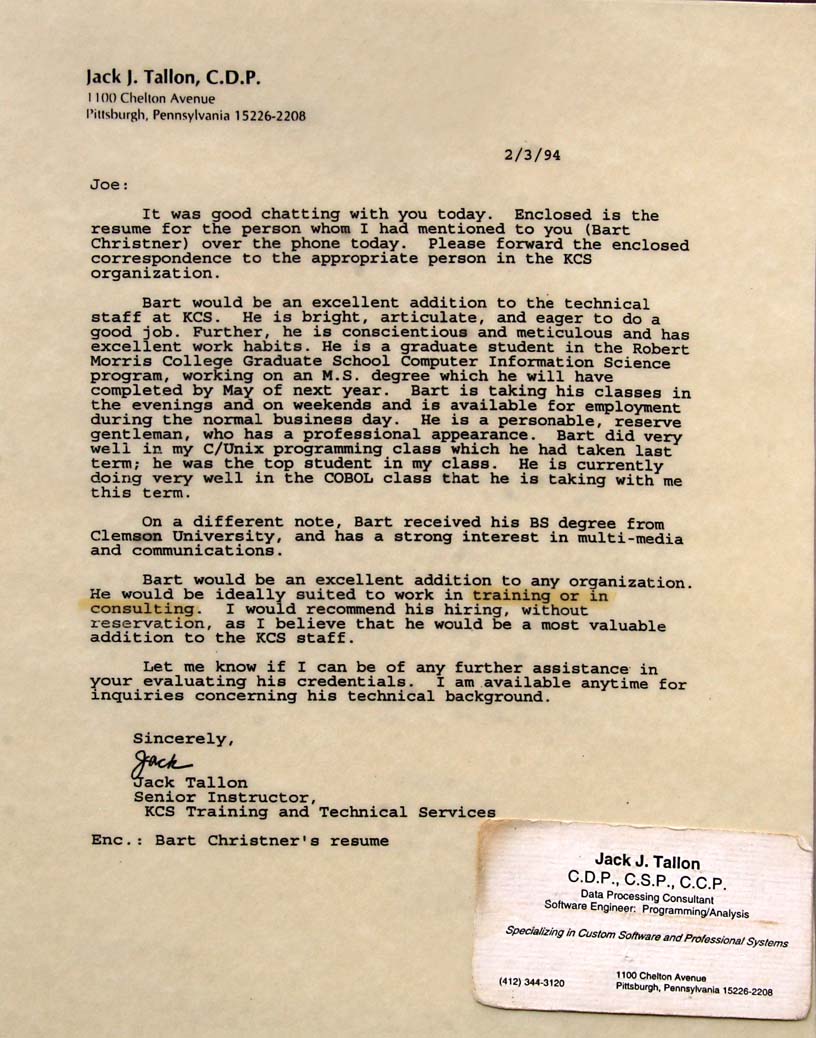- Bart would be an excellent addition to the technical staff at KCS. He is bright, articulate, and eager to do a good job. Further, he is conscientious and meticulous and has excellent work habits. He is a graduate student in the Robert Morris College Graduate School of Computer Information Science program, working on an M.S. degree which he will have completed by May next year. Bart is taking his classes in the evenings and on weekends and is available for employment during the normal business day. He is a personable, reserve gentleman who has a professional appearance. Bart did very well in my C/Unix programming class which he had taken last term; he was the top student in my class. He is currently doing very well in the COBOL class that he is taking with me this term.