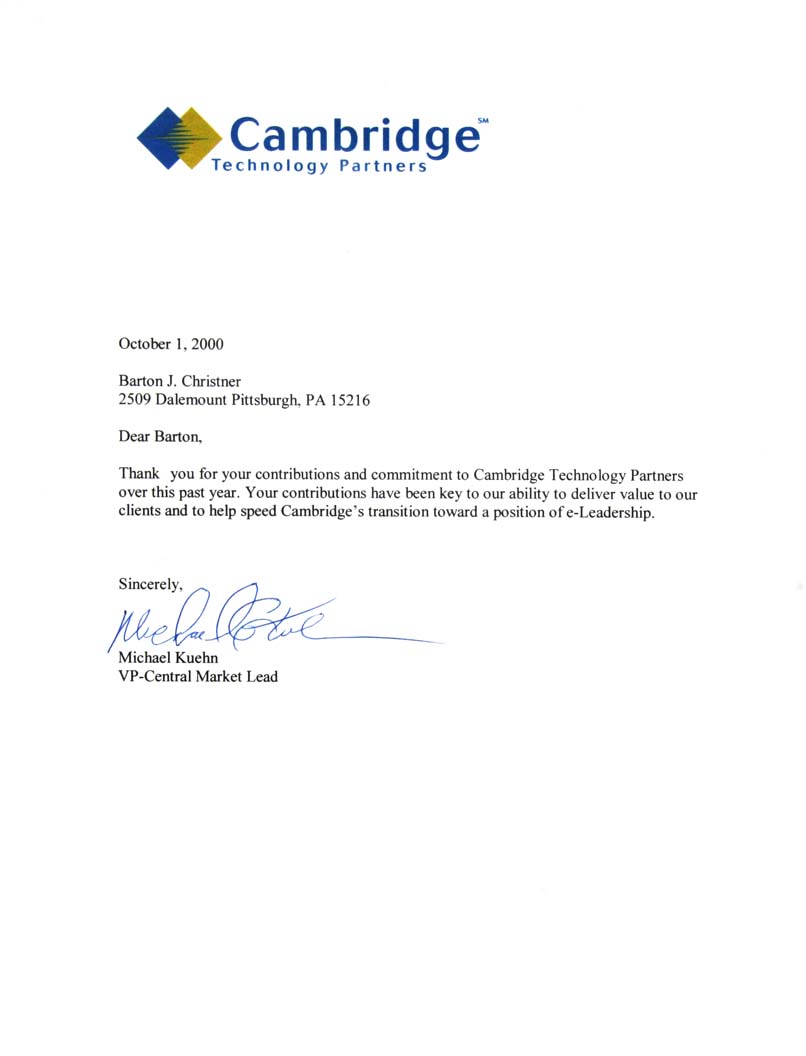 - Thanks you for your contributions and commitment to Cambridge Technology Partners over this past year.