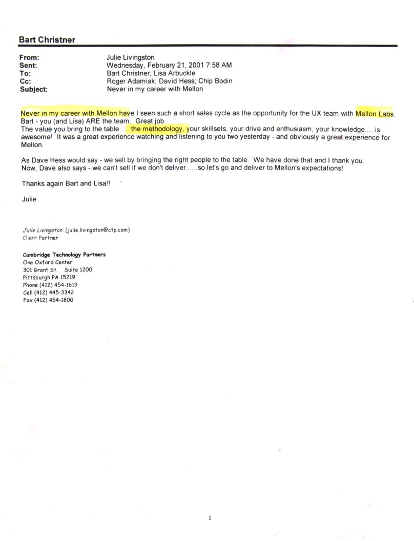 - Never in my career with Mellon have I seen such a short sales cycle as the opportunity for the UX team with Mellon Labs. Bart - you [and Lisa] ARE the team. Great job.