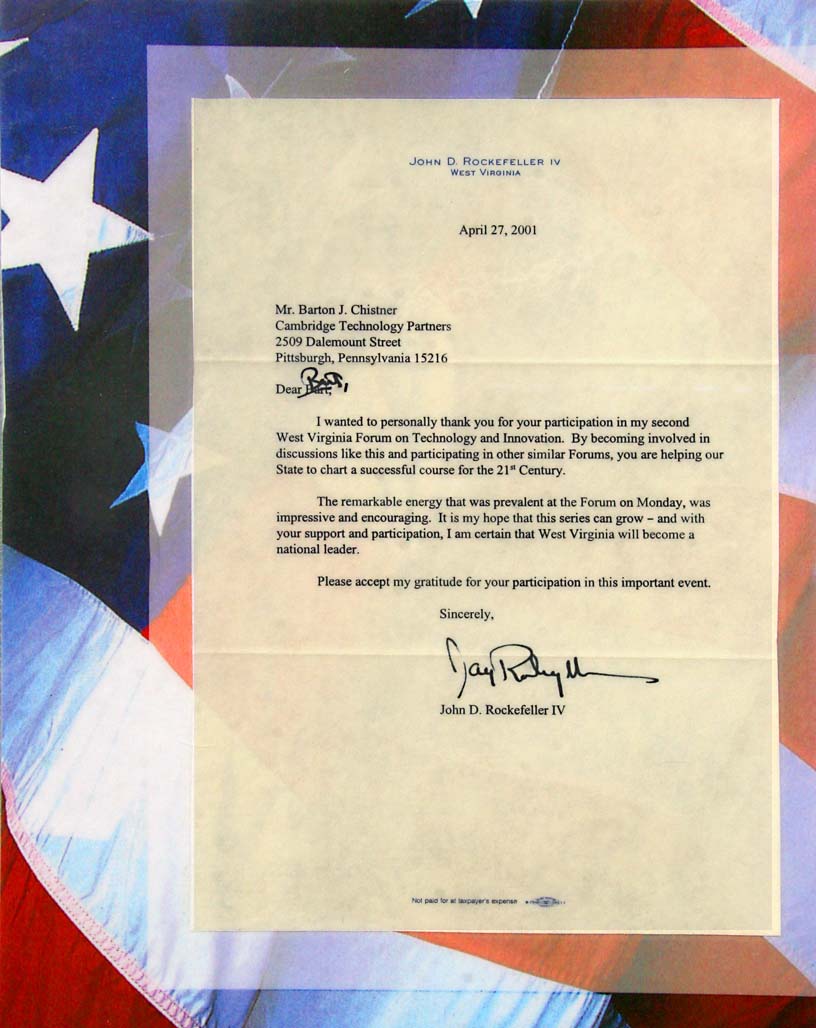 2001 04 27 RECOGNIZE "John D. Rockefeller IV" LETTER