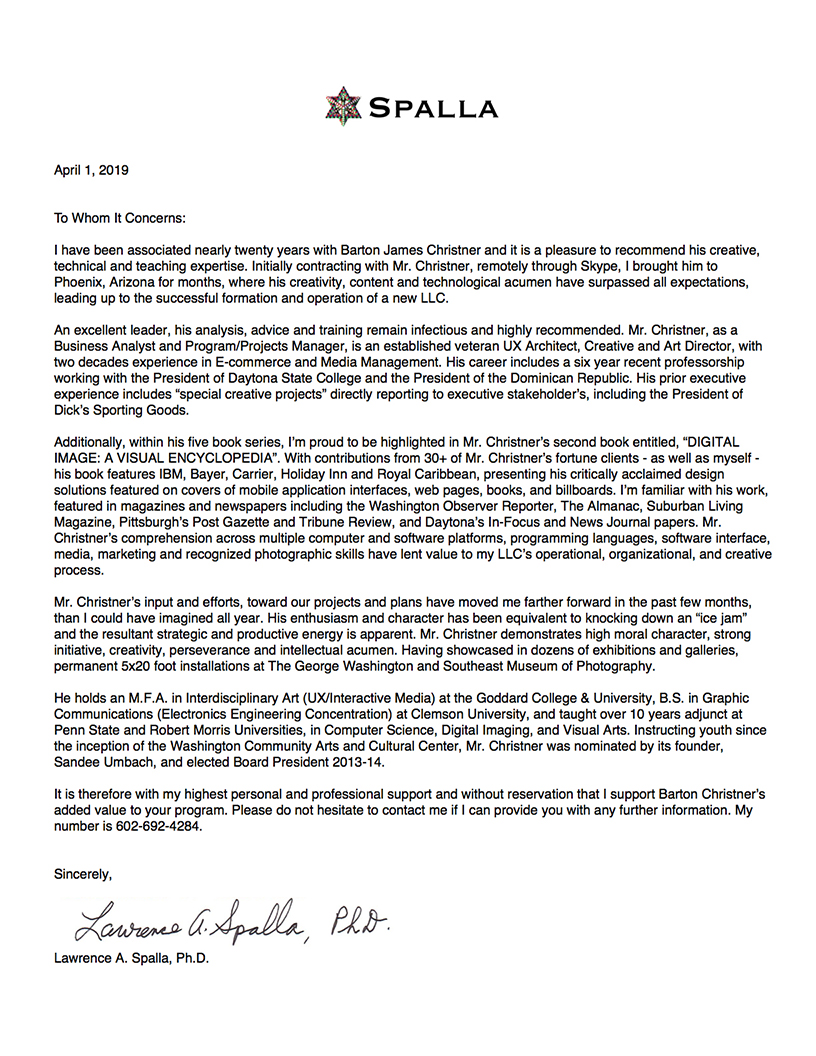 - I have been associated nearly twenty years with Barton James Christner and it is a pleasure to recommend his creative, technical and teaching expertise. Initially contracting with Mr. Christner, remotely through Skype, I brought him to Phoenix, Arizona for months, where his creativity, content and technological acumen have surpassed all expectations, leading up to the successful formation and operation of a new LLC.